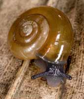 Smaller than the Girdled Snail, it is a Garlic Snail (Oxychilus alliarius) so named because of the odour that its bluish body gives off when you pick it up! The larger individual measures about 7mm across, and compared with the Girdled shell its shell is flatter and glossy, with a pronounced lip. Also, when you turn the snail over you can see a definite hole, called the Umbilicus through the centre of the spiralled shell - I must take a photograph to show that!