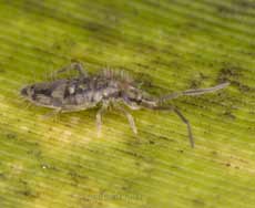 Back at the Bamboo, there was neither a snail nor a Springtail to be seen - they must have retired down into the layer of dead leaves. I decided not to disturb the leaves tonight, but was still able to see this Barkfly that was in its very damp silk shelter on the underside of a leaf.