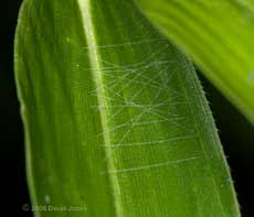 On the upper side of another leaf, the damp air had helped to show up this very neat arrangement of silk. Although I couldn't see any Barkflies near by, I think one was probably responsible for this web.