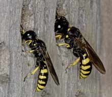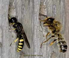 The night before last there were two similar wasps taking a lot of interest, especially in one of the holes. These two images show them at exactly the same scale. While their markings are almost identical, the right-hand wasp is noticeably larger and had slightly lighter feet. Are they a male and a female?