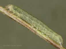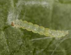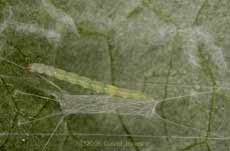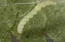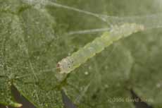 As I was doing a bit more pruning in the garden two days ago I (as usual) checked the branches that were cut off, and on another Elder leaf I found this caterpillar, measuring just over 9mm in length. After I took several photographs of it wandering over a leaf, I left it overnight. By yesterday morning the leaf was nearly completely folded over along the axis of the main vein.