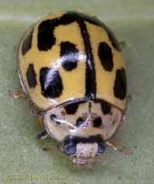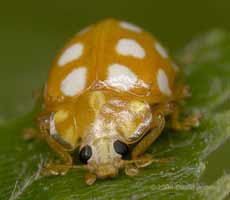 Up until the middle of June there had been very few aphids here, but their numbers are now increasing rapidly. While the ants are taking advantage of the situation, it is still very unusual to see a ladybird here. Away from the Birch tree this is the only example I have seen in the garden this month so far. It is a spots free variant, 14-spot ladybird (Propylea 14-punctata) with a very pale head and pronotum (thorax).