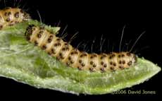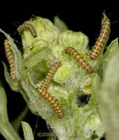 Today there were several groups to be seen around flower buds at the ends of stems. from a distance the black spots almost seem to blend together now to form the dark bands described in my caterpillar guide.