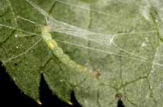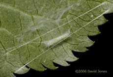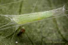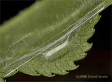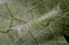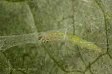 The two diagonals in this picture are bundles of silk that put this section of the leaf into a curve. Suspended below these tensioning 'cables' is a silk tube which surrounds the larva. Towards the centre of the leaf (top-left in the picture) there is a cobweb-like barrier which I presume is a protective measure.