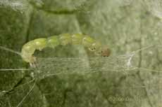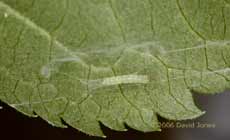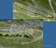 7 July - The heatwave described in that last report came to a rapid end the following day, in the way they usually do. However, the thunderstorms missed us. The thunder was distant and I only saw one lightning flash over the treetops. Since then it has been a case of sunshine and occasional showers, with cooler temperatures, with today reaching just 20C. We are getting regular visits from up to four young Blue Tits, and today there were also a couple of juvenile Great Tits - could they be ours? The House Sparrows continue to feed their young, both in and away from the nest, and we get frequent visits from the small, local flock of Starlings with their youngsters. Yesterday I caught a glimpse of a fledgling Blackbird, which is still being fed. There are at least two juvenile Goldfinches about. Sadly, we haven't seen the young Thrush since the last diary entry. The small birds all have to be very careful at the moment as the Sparrowhawk has reappeared after a gap of several weeks. I think it may have taken a sparrow here this afternoon. Tim Norriss has suggested that the caterpillar in the 'hammock' could be that of Lyonetia clerkella, the Apple Leaf Miner micro-moth. Despite its name, I see accounts of its caterpillar mining in Silver Birch, Hawthorn, Cotoneaster, and ornamental Cherry, as well as Apple. Yesterday morning I found another one of them on an Elder leaf, and this time the larva was still working on it. Despite the fact that the main structure had been completed I was able to spend quite a long time watching as it worked on the suspended tube.