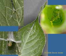The leaf seems to be thriving in a container of water, so I hope to keep it long enough to see when the moth emerges. I've organised a plastic bottle 'bell-jar' over it, and I will be checking it frequently over the days to come. The caterpillar in the folded leaf hasn't changed, and seems to be still hungry - there are numerous small holes in the leaf now. Click on the images to see larger versions - |