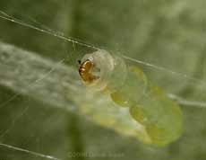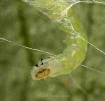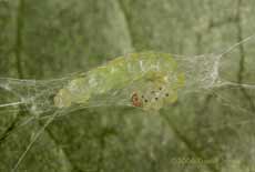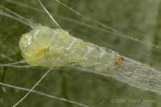 Over several hours, the larva (actually a caterpillar) spent most of the time working in a very methodical way on the tube itself and its supports. It would wriggle most of the way out of the tube to secure another strand of silk,