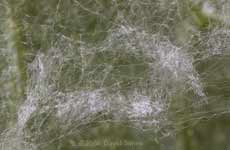 This is a closer view of the silk barrier. Unlike the threads that are stretched out under tension, these threads, like those of the tube have a very wavy (or is it a spiral) appearance.