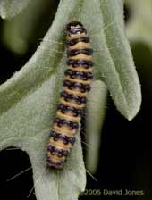 On the Ragwort, the more advanced Cinnabar Moth caterpillars are now taking on their 'text-book' appearance with the black spots having merged to to create their characteristic black bands. This one measured about 1cm in length.