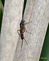 A short time later (around 8am), a stroll down the garden was rewarded with the first pictures of the day. First, this parasitic insect with a long ovipositor which is partly hidden by the leaf. It flew away before I could manage a second shot. I can only estimate that its body (without ovipositor) was around 1cm in length.