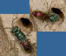 Yesterday, another visitor showed up like a jewel in the sunshine, a ruby-tailed wasp, probably Chrysis ignita. It is a cuckoo wasp, laying its eggs in the nests of other insects. However, yesterday it kept going in and out of an unoccupied hole. It spent the night in there and I don't think it left it all day today - I can see its green face deep in the hole when I shine a torch at it. To give an idea of scale, the hole has a diameter of 4mm.