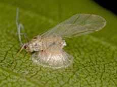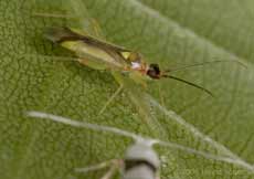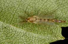 Exhibiting similar colourings was this gnat under another Birch leaf.