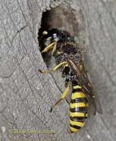 Activity at the bee hotels has been more intermittent, possibly because of the cooler cloudy conditions. However, the sunny periods bring out the swarm of small bees, and the occasional wasp. I first photographed this one on the 16th, but here are a couple of closer images from this afternoon. So far, the nearest ID match I can find is Ectemnius sexcinctus, although this individual lacks the small yellow markings at the rear of the thorax seen on other images of that species. The hole has a 5mm diameter.