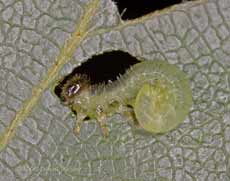 Quite a few of the leaves on the lower branches of the Birch tree are now becoming peppered with small holes. Close inspection reveals that the culprits are sawfly larvae.
