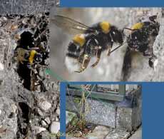 One side of the shed is supported on concrete building blocks (behind which is our unoccupied hedgehog house, once used by bumble bees). This time the bees have the entrance to their nest in the gap between two block at the corner of the shed (lower, and left image).