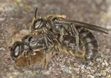 I did manage this picture of a mating pair of the small solitary bees (probably Heriades truncorum).
