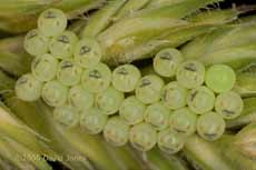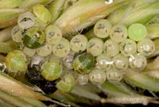 Back on the 16th I photographed some eggs on the flowerhead of grass by the big pond. At that time they only appeared as green spheres, but yesterday markings were visible on all but one of the eggs - I guess that one may not be fertile. Back in mid-June last year I found a similar group of eggs on a Birch leaf. In that case it was shieldbug nymphs that emerged.