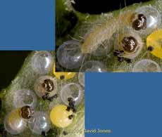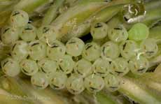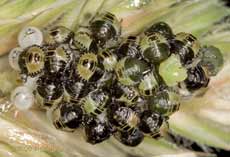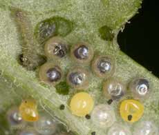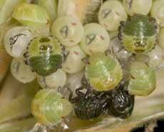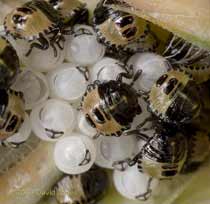 As the exoskeletons of the nymphs harden this close-up shows several at different stages, with a newly emerged individual in the top-left corner and a couple of the first to emerge looking very dark at the bottom of the picture. Notice how the red spots seen in the eggs are in fact the eyes of the nymphs.