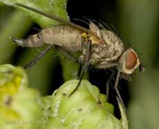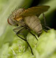 The first flowers of the Ragwort are now starting to open, and the flower heads have their usual visitors, flies that lay eggs in the buds. These arrive at this time each year, and their larvae badly damage the flowers.