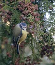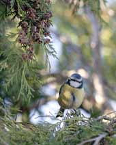 The Blue Tits have been very active in the garden for quite a while now, and are back and fore to the bird table (where they find chopped peanuts waiting) all day. When not feeding there, they spend a lot of time in the conifers where the clusters of small cones appear to be opening at the moment.