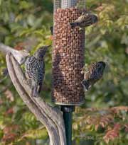 It was still feeding as I crept into the house, but by the time I got upstairs with my camera it had been replaced by Starlings and Sparrows. The wood being used as a perch by the Starling is a piece of driftwood brought back from Cornwall.