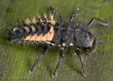 This afternoon I needed to record another, less welcome first in the garden. Having intercepted an adult Harlequin Ladybird as it arrived in the garden on the 11th October, I have now found a harlequin Ladybird larva for the first time, actively moving about on one of the bamboo plants that line the area of the garden where we park our Discovery. It's just over 6mm in length.
