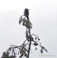 I did hear, and then see the Great Spotted Woodpecker again when it perched on the same conifer that it used a few days ago. The red patch at the back of the head (best seen in the large image) indicates that it's a male.