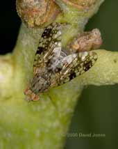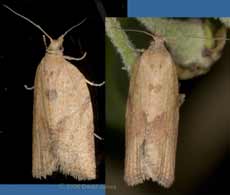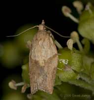 Last night I found just one moth on the Ivy (right in this picture). The one on the left was on our patio window. I assume that they are the same species (they look like the Light-brown Apple Moth that I photographed on the 6th, but I've included both pictures because of the difference in intensity of the dark spot on the wings. Both moths were about 10mm long.