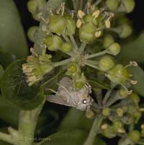 6 October - Both yesterday and today we have seen a lot of rain, and at lunchtime it is very dark and dismal outside. Last night the rain did stop for a while and I was able to take my camera down the garden to check for insects on the Ivy. Not surprisingly, there wasn't a great amount of activity. You could certain smell the Ivy from the other end of the garden, but I wonder how much of the nectar deposits get washed off in the rain.