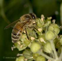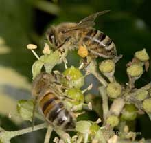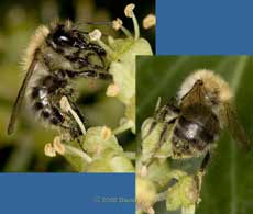 The wasps and true flies are still much in evidence, as are the Drone-flies and Honey bees, as seen here. The upper one was the only one that I've seen on the Ivy with pollen sacs.