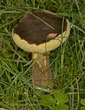 This second one is smaller but more more spectacular in appearance. Growing out of the side of a stump of what I thought was conifer wood, the largest head is about 23mm across. The drops of liquid have been there all day even though most of the moisture from this morning's rain had long evaporated. There are three large images for this. A very good match in my fungi guides (and further checks on the web seem to confirm this) is Rhodotus palmatus, The Wrinkled Peach fungus. The problem with this ID is that R.palmatus (a Red List species) is associated with Elms rather than conifers - perhaps I'm wrong about the log which was left with me some years ago by one of my tree surgeon sons! Thinking about it, The last fungus I photographed (14 January) on this log was Jew's Ear Fungus which also grows on hardwood rather than the softwood of a conifer. Back on the 6th I photographed a Boletus(?) fungus in the grass. A second fruiting body has now popped up next to it.