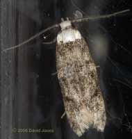 There was this second, smaller moth on the window, measuring about 7mm in length. I think this one is a White-shouldered House Moth (Endrosis sercitrella).