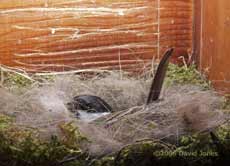 The female continues to bring in soft bedding to supplement the material already compressed around the nest cup. As usual, she just dumps it around the sides ready to work into the nest later.