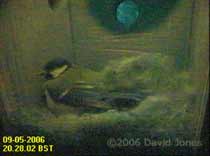Finally, a webcam image from last night, when mum was managing to stay in the nest cup with the nestlings. The bright disc on the right side of the box is caused by a neighbour's security light which, fortunately, doesn't come on too often! Tonight at 8.45pm she is perched at the side of the box as a chick preens just below her.