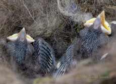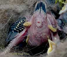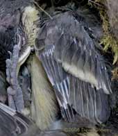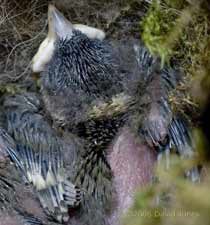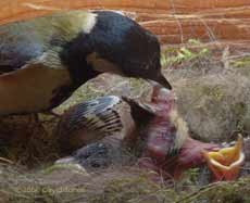 The feed is followed by the other responsibility of parenthood as she removes a faecal sac from the anus of a chick. At least these are conveniently packaged. Just to the left of the chick's rear end you may just make out the stumpy growth that will become its tail feathers.