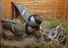 14 May - (The thirteenth day for all but one chick) - This is going to be the last week of Great Tit nest watching for this year, with fledging due after around 19-20 days (in 2004 it was 19 days) On a largely overcast day, progress towards that goal has continued without problems, with the female a lot less stressed than yesterday, although I was still wary of taking too many liberties.