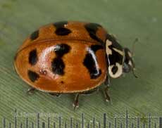Michael Majerus, the country's top authority on ladybirds, has identified it, not as a Harlequin, but an unusual form of the 2-Spot Ladybird Adalia bipunctata, and the colour form is known as 'simulatrix' or 'Spotty'! I knew there was something unusual about it, but I would never have considered it as a 2-spot.