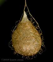 I assume that it is an egg case, and it is fascinating how the case itself is smooth in texture, but is surrounded by what looks like a loose tangle of coloured silk which then continues up to form the supporting strand.