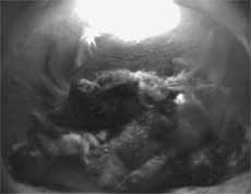 14 August - Well, the internet connection works fine now, with a new cable modem having been installed at the end of last week. Having said that, the poor quality of the webcam images today must be blamed on the weather. It has been dull and wet, and there has been at least one adult in the nest with the chicks all through the day. The four chicks appear to be doing well, and yesterday I saw one reverse up to the entrance for the first time to (presumably) deposit a faecal sac outside the nest. Thinking back to the hatching of the eggs, I didn't see the adult eating any egg shell, and I found two shell halves on the ground below. I was surprised just how delicate they are. When freshly collected they seemed to flex slightly when handled, and thinner than I had expected. I measured a few fragments and found that the thickness was just over 1/400in (0.0026in, 0.066mm). In comparison, the ordinary paper that I use in my printer is about 1/250in (0.1mm) thick. It's amazing how a structure so thin is able withstand the treatment the eggs got as the adults tread on them, sit on them and roll them about in the nest prior to hatching! I must apologise for the continued lack of diary entries to accompany the webcam. I have been watching and recording a couple of hours each day, but I'm afraid that the CFS that is plaguing me at the moment seems to drain both energy and powers of concentration to do tasks like processing images etc. When things get back to normal for me I will try to put together a record of what has happened.