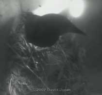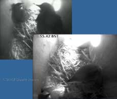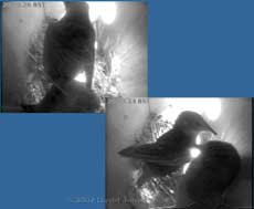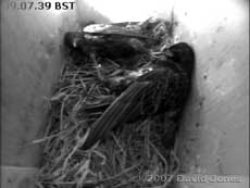 When recording started at 5am both chicks were already active and approaching the exit. Flickering light levels outside suggested that an adult must have been making close approaches to the nest, and one entered the box briefly, although I didn't see it pass any food to either chick.