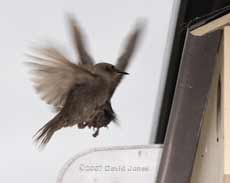 Several times, what I assume is 'our' fledgling turned up with one of the parents. It made a couple of attempts to land at the nest entrance, and on this occasion nearly collided with an adult making a food delivery.