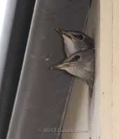 Inside the box, things didn't always goes smoothly. While I was outside I heard the sounds of squabbling at least half a dozen times. In the exchange illustrated here, one of the chicks ended up pinned down on its back, reminiscent of the fights I saw between adults early in the nesting process.