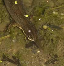 This second male has a large cockle on a rear foot, but it doesn't prevent it from stalking tadpoles. Notice the well developed crest of a male in breeding condition.