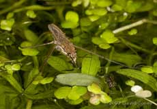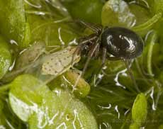 Finally, the edge of the pond inevitably has a 'strand-line' of duckweed that was washed up during rain (which we had yesterday). This afternoon I spotted this spider tackling an aphid amongst that debris. The aphid's body is about 2mm long, and the spider 3mm. |