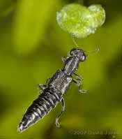While watching the Shore-flies, I almost missed another insect that was crossing the water. This small rove-beetle was moving across the surface film with hardly an impression made by its feet. I didn't get the chance to measure it, but I estimate its length to be something like 7-9mm.