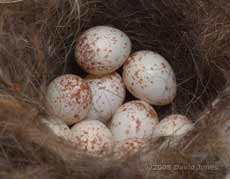 A lunchtime snap of the nest cup showing nine of the ten Great Tit eggs.