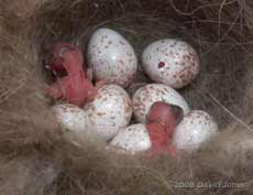 29 April - After yesterday's excitement I'm afraid I've had a bit of a slow start this morning. So far, at just before 9am I can confirm that the Starlings now have a full set of five chicks to feed, and the Great Tits now have six chicks. My slow start failed to turn into something more energetic during the rest of the morning (thanks to the CFS) but I did go down the nest box for a very short time and came back with this picture. While having breakfast soon after 9am we had seen a shell being eaten, and the photograph shows seven chicks at 11am. At noon there are still two intact eggs.