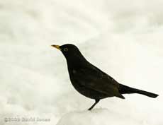 Anyway, it had me up and looking out on another inch of snow that had fallen during the night. The paths, cleared yesterday are white again, but this time the snow is very wet. Once I regained my senses (nearer 8am by now) and was putting fresh water in the bird bath, the temperature outside was just over +1C and it was raining steadily, although that soon stopped. No prospect of 'good' snow pictures this morning so I've confined myself to this image of the edge of the veranda, with human, cat and Blackbird footprints in what is very soggy snow.