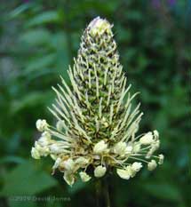 A very different flower is presented by the Ribwort (or Narrow-leaved Plantain - Plantago lanceolata). It produces this flower spike, with white Stamens and rather inconspicuous anthers that protrude like thin fingers around the spike. As they get older the stamens will turn brown and the spike becomes quite drab.