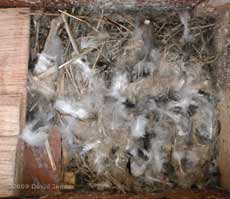 First, the pair in SWup clearly had a head start with the House Sparrow having produced what seemed like a perfect nest cup for them. As this picture (taken from above the entrance) confirms, the pair brought in very little in the way of feathers, and virtually no plant down during the last six weeks.